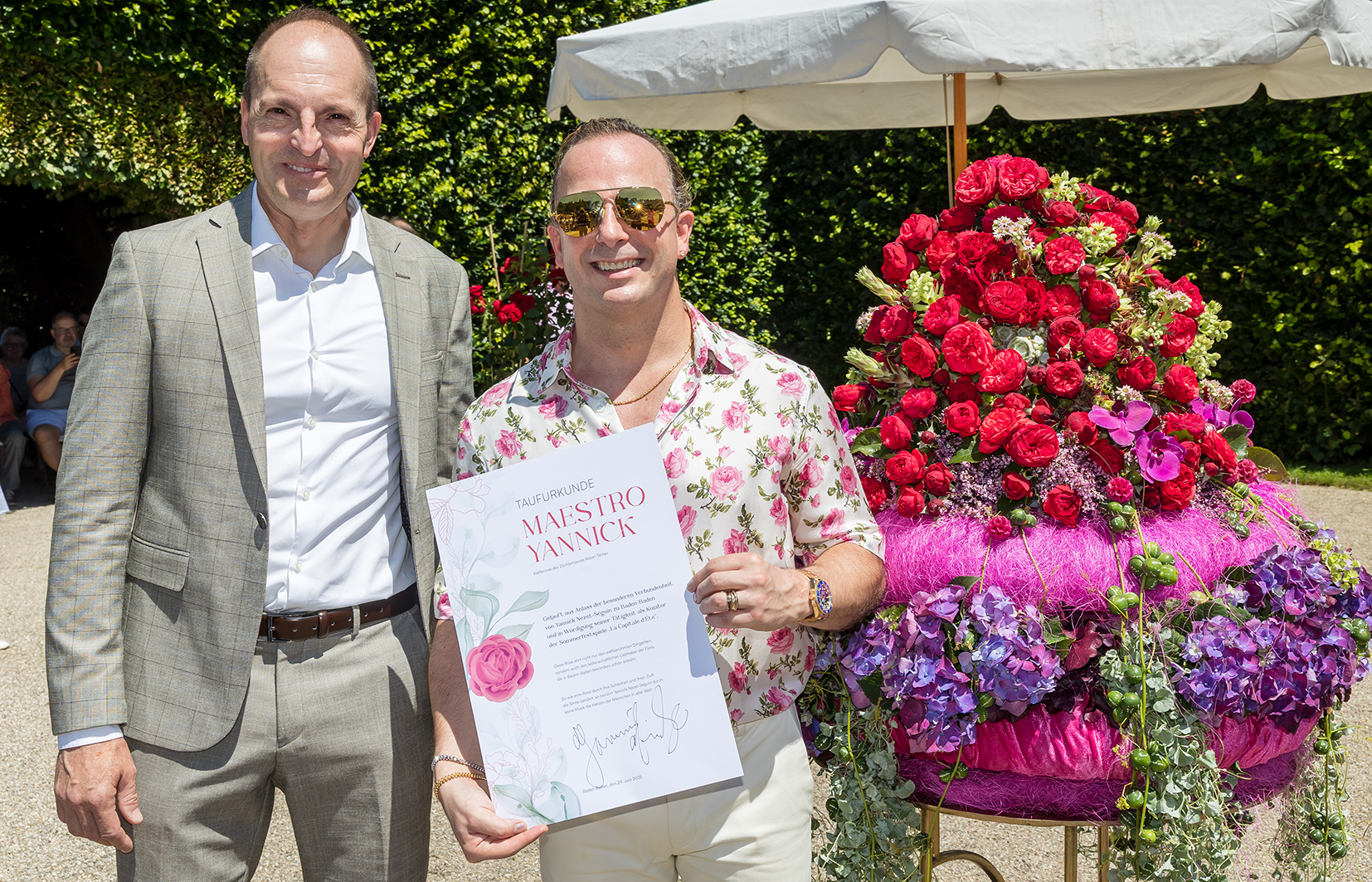 Die Rose “ Maestro Yannick“ aus dem Hause Rosen Tantau wurde im Sommer 2025 in der Gönneranlage feierlich getauft. Gewidmet ist sie dem Dirigenten Yannick Nézet-Séguin.